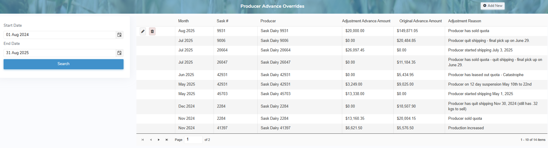 •View of producer advance overrides including adjusted amounts and the reasons for each change