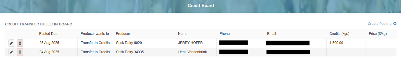 The Credit Board displays the credit transfers posted by individual producers. Credit transfer postings may display on the Credit Transfer Bulletin Board Board for up to two months unless they are removed or renewed. If a producer subscribes to posting alerts, they will receive an email whenever there is a new posting.