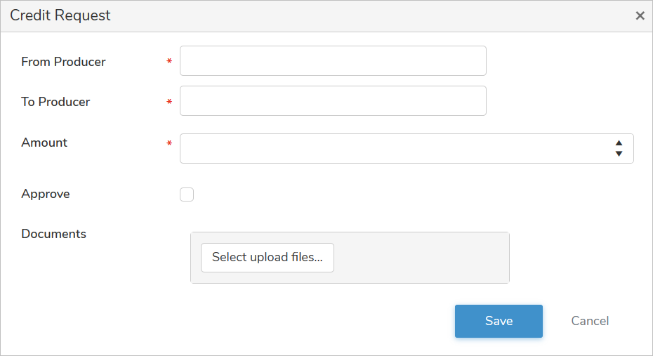 The Create Request dialog allows you to make limited updates to a credit request. From this dialog, you can edit the credit transfer amount, change the status of the request (approve or cancel), and upload supporting documents as needed.