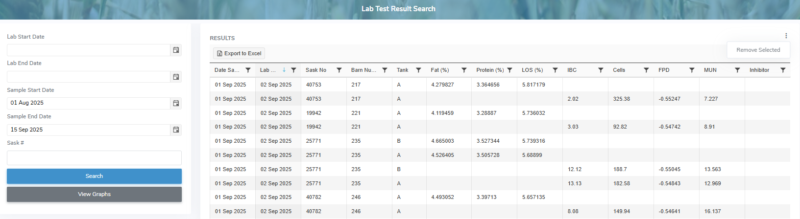 •Ability to search for lab test results by lab start/end dates, sample start/end dates and Sask #