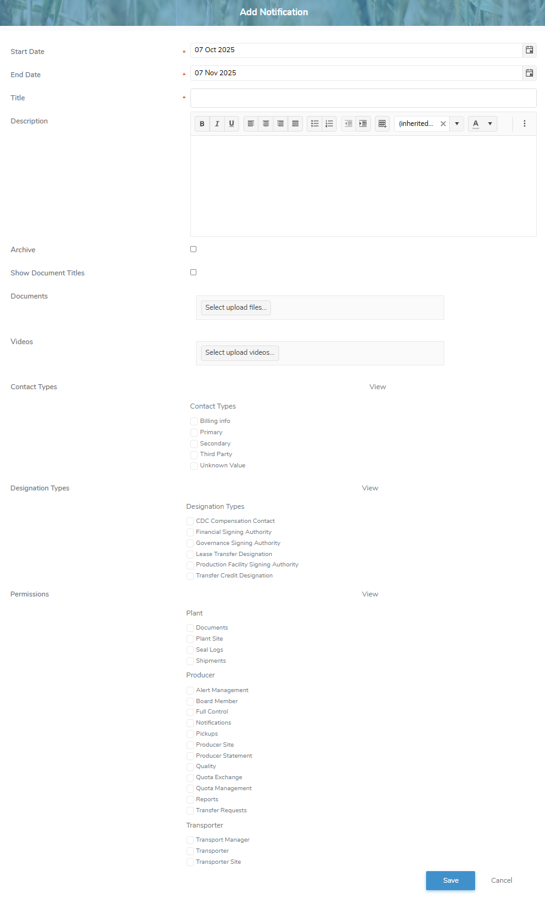 Note: If the check box is blank (not selected), then all contact types, designation types and/or permissions will be able to view the notification.