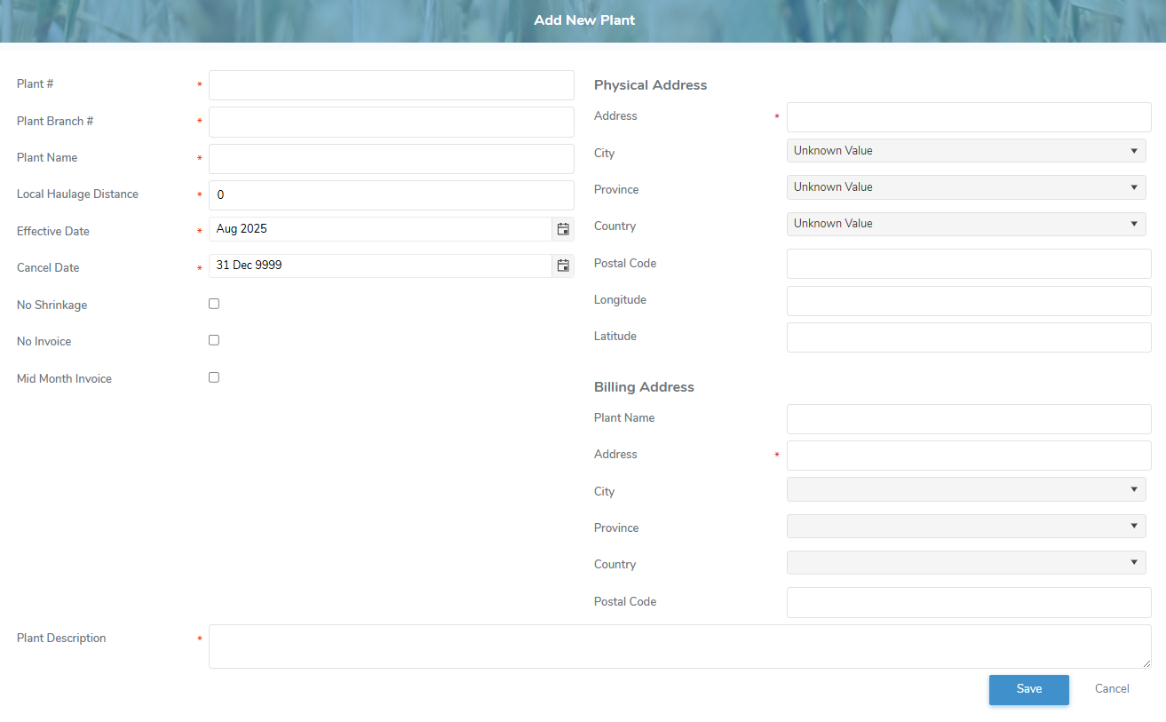 •No Invoice: Select the check box if invoices should not be generated for the plant.