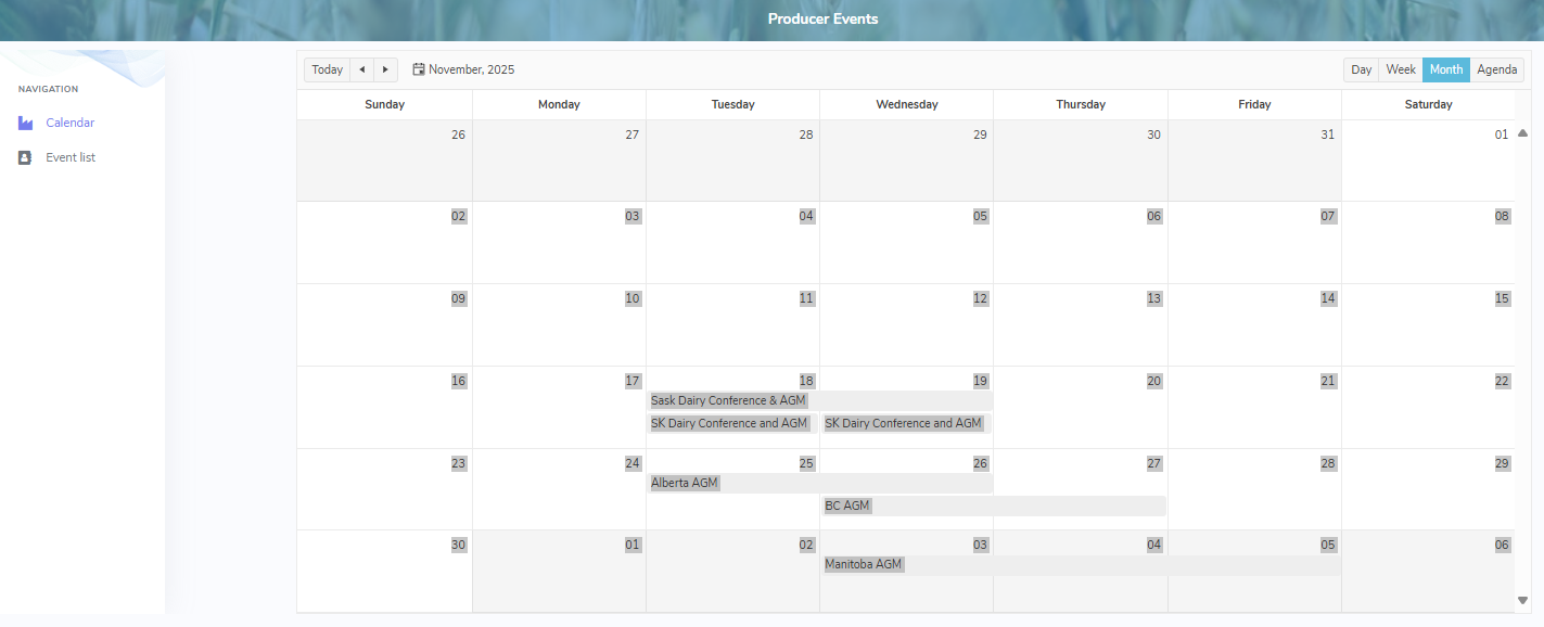 The Producer Events page displays a calendar listing of scheduled producer events.