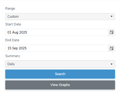 Note: The default range is set to Last Month. To view a different period, select Custom and choose a start and end date. Then select the summary format you want to see (i.e., daily, monthly, yearly).