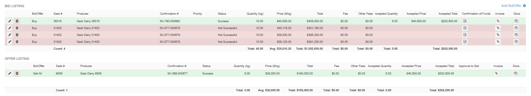 During the Open and Closed stages, administrators can monitor and manage all bid and offer listings to ensure accuracy and completeness. Producers can create or edit their submissions only while the exchange is Open, while administrators maintain oversight and can make necessary adjustments during both statuses to support an accurate and orderly exchange process.