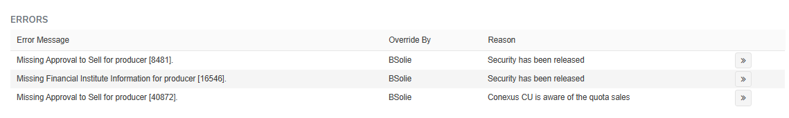 •Click Expand icon of the Error Message you wish to view on the Errors screen to open the Override dialog and view or override the error message as needed.