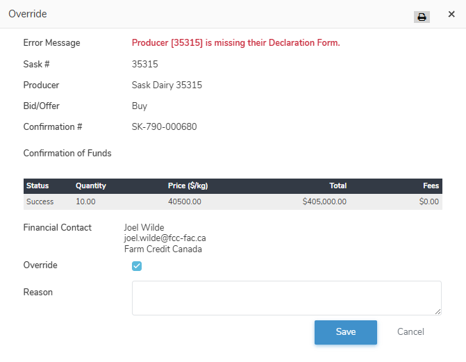 The Errors screen displays issues that must be resolved before the quota exchange can be published. These errors often include missing forms or incomplete declarations associated with producer bids. Administrators can review each error, provide notes, and override specific items when valid confirmation has been received (e.g., by phone or email).