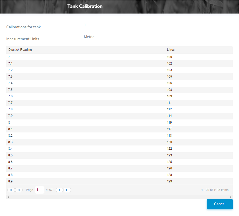 •Click Calibration icon of the tank you wish to view to open the Tank Calibration page.