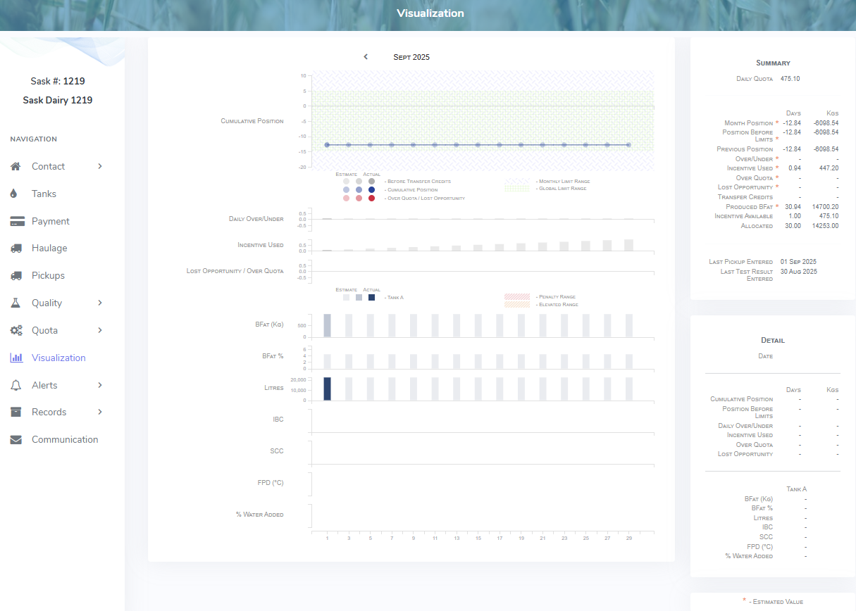 The Visualization page displays graphically the cumulative position, daily over/under, lost opportunity/over quota, and milk components for the month selected.