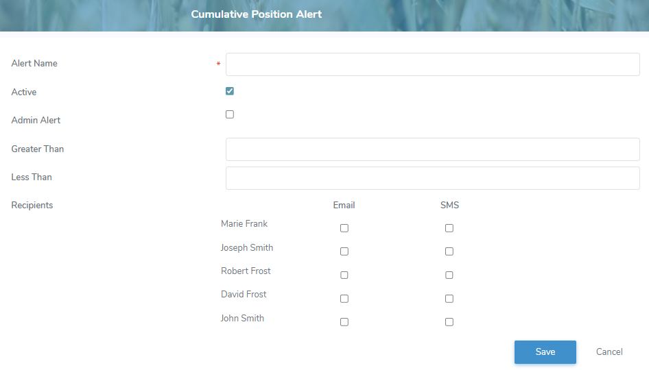 << Click to Display Table of Contents >> Navigation: Administrator Dashboard > Producer Information > Producers > Viewing producers > Alerts Information > Cumulative Position Alerts > Managing Cumulative Position alert |
