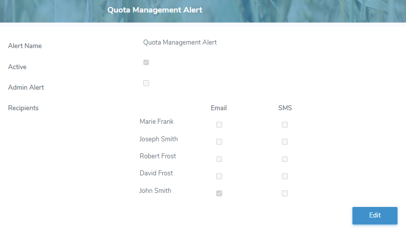 The Quota Management Alert page displays the recipients who receive notification when the Quota Management sheets are published.