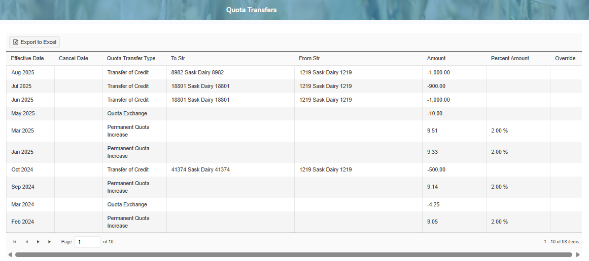 •View list of the quota transfer type, to/from, amount and percent amount by effective date and cancel date.