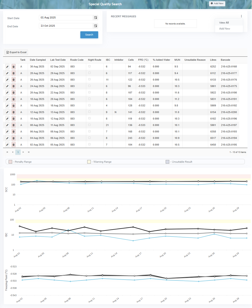The Special Quality Search page displays the quality test results for each pickup and identifies any samples that fall within the penalty, warning, or unsuitable ranges. Graphs provide a visual summary of the current data.