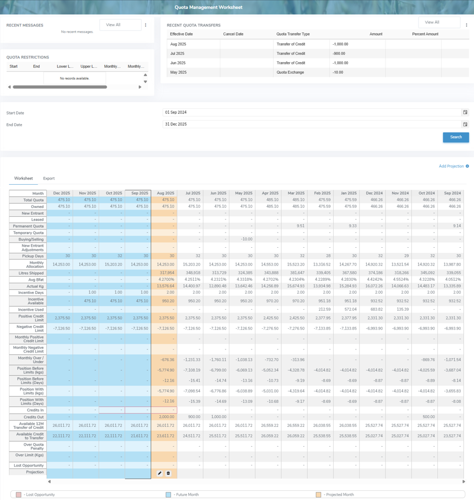 The Quota Management Worksheet page gives an overview of the producer's recent, quota messages, quota restrictions, recent quota transfers, and the ability to predict and monitor the potential effects on the producer's quota over a 16 month period.