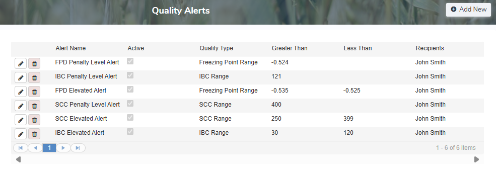 The Quality Alerts page displays quality alerts created by the producer and/or administrator.