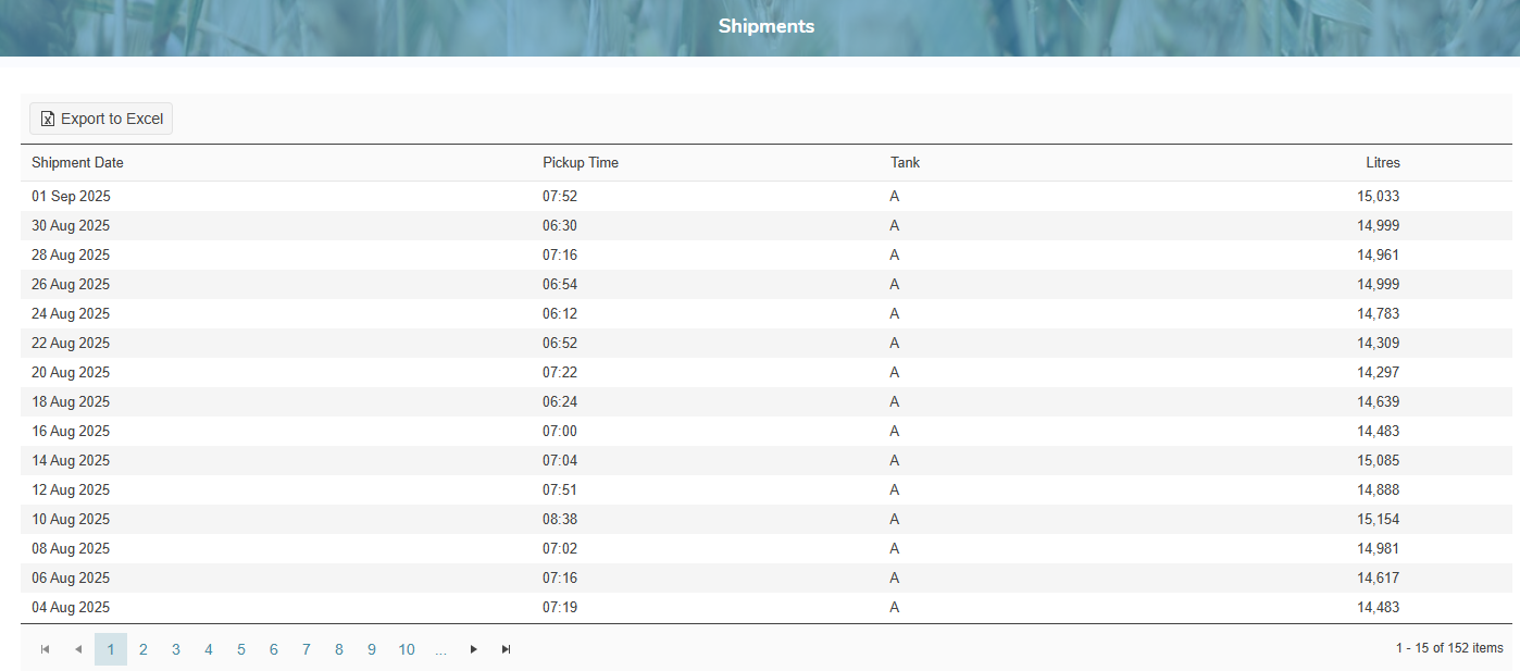 The Shipments page displays a list of the producer pickups for the last eighteen (18) months including shipment dates, pickup times, tanks, and total litres for the pickup.