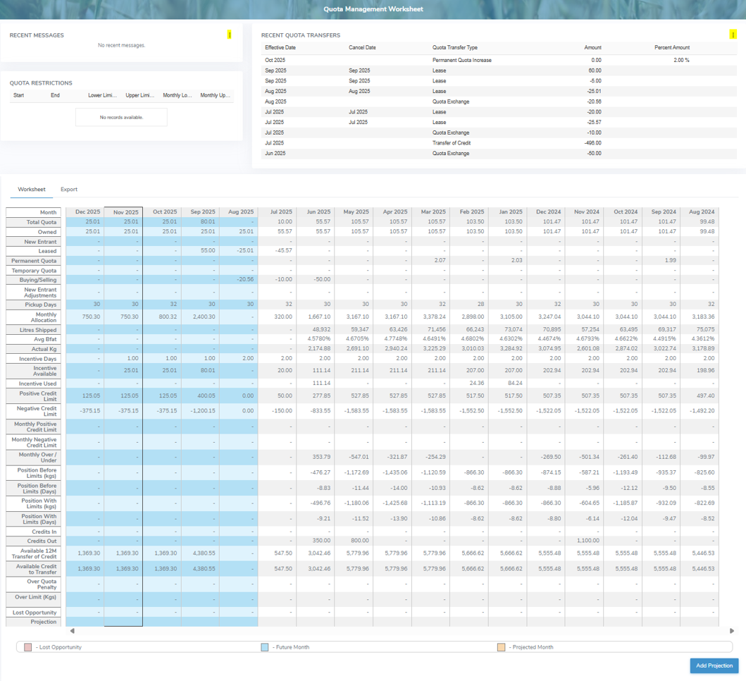 The Quota Management Worksheet page gives an overview of your recent, quota messages, quota restrictions, recent quota transfers, and the ability to predict and monitor the potential effects on your quota over a 16 month period.